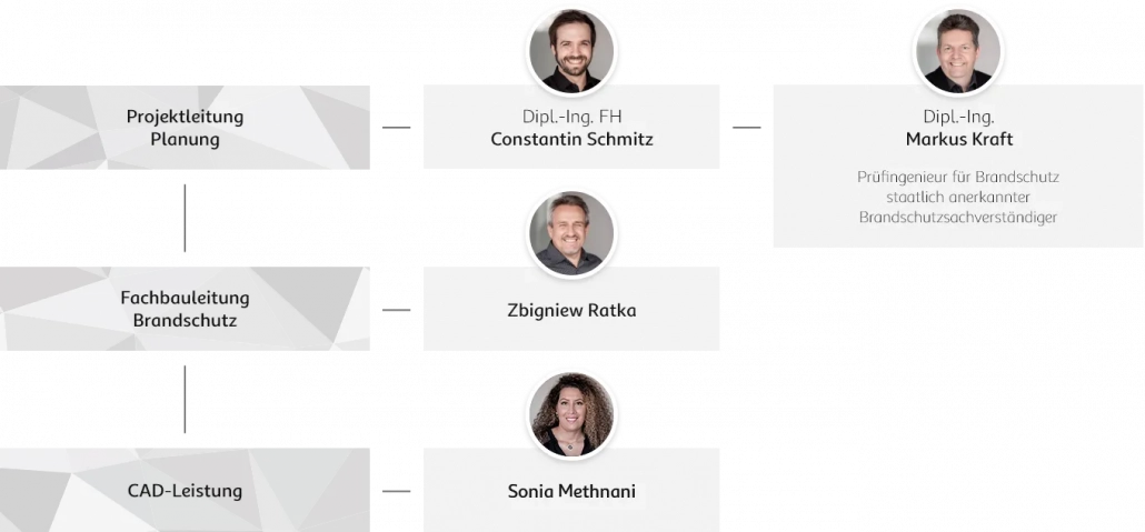 - frühzeitige Erstellung von grafischen Brandschutzgrobkonzepten und Dokumentation der Eckpunkte in einer Tischvorlage für Bauherrn und Planer